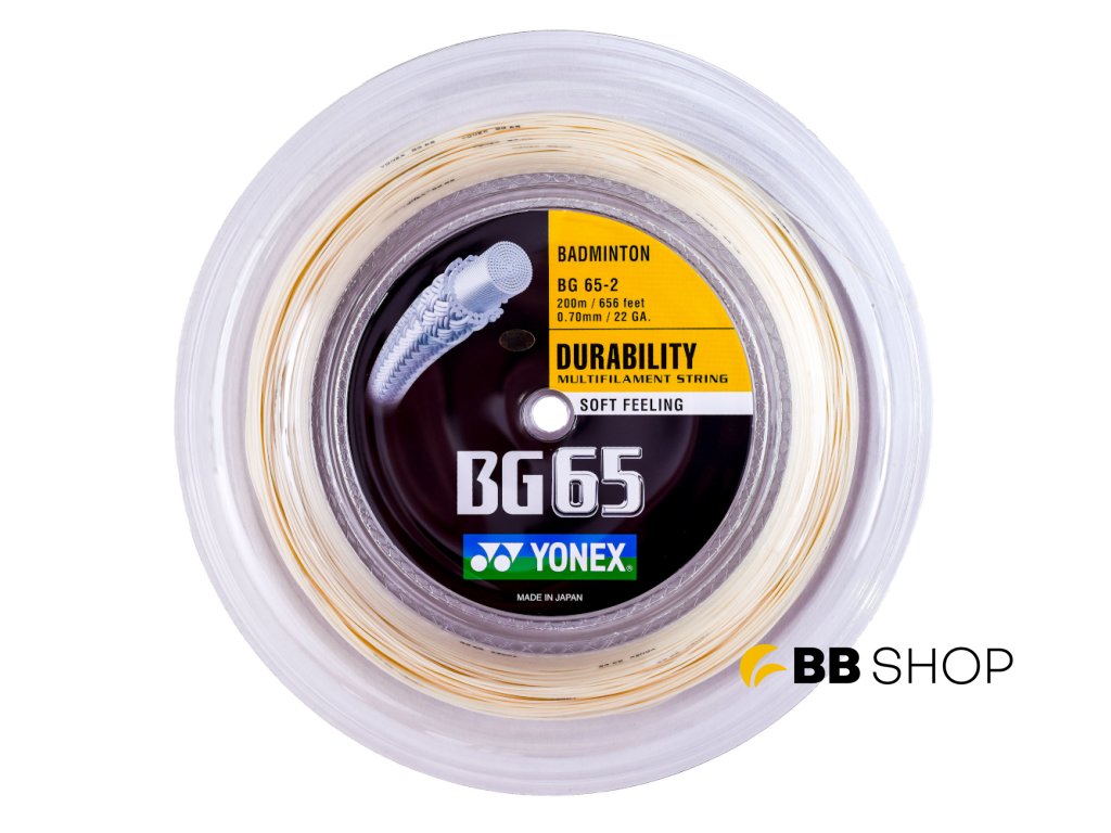Multifilamentní badmintonový výplet BG 65 patří do kategorie strun „soft feel“ a vyniká především svou extrémní trvanlivostí. Tuto skvělou trvanlivost zajišťuje speciálně opletené vlákno výpletu, které výrazně snižuje obrušování struny. Jádro výpletu je tvořeno materiálem High Polymer Nylon Multifilament, které je opláštěné speciálním spleteným Polymer-Nylonovým vláknem. Kvalitu tohoto výpletu potvrzuje i jeho velká oblíbenost mezi závodními českými i světovými hráči.